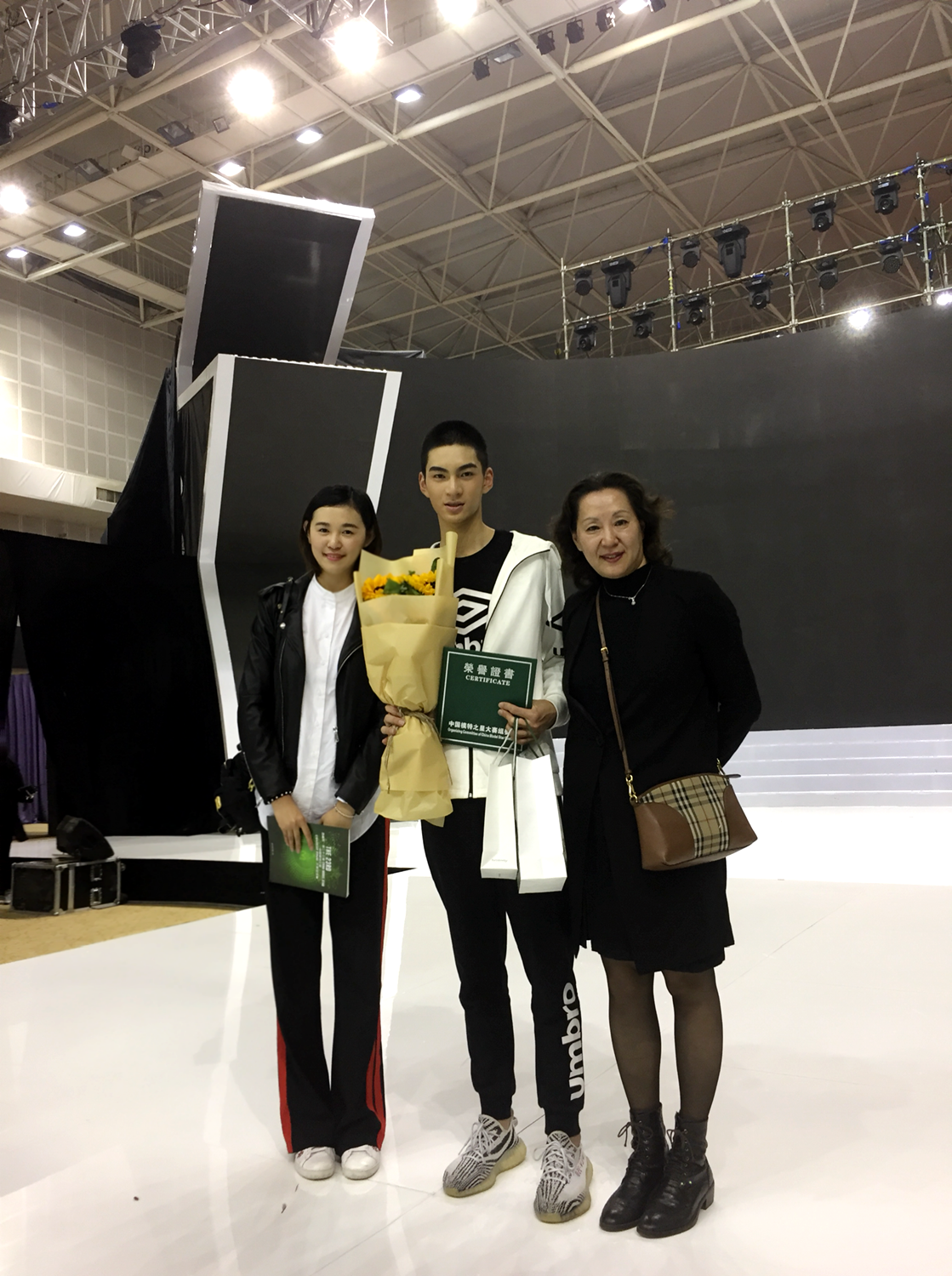 彭鹏与中国著名的模特经纪人、东方宾利公司的副总经理崔丽娜(右)和指导老师陈峥(左)