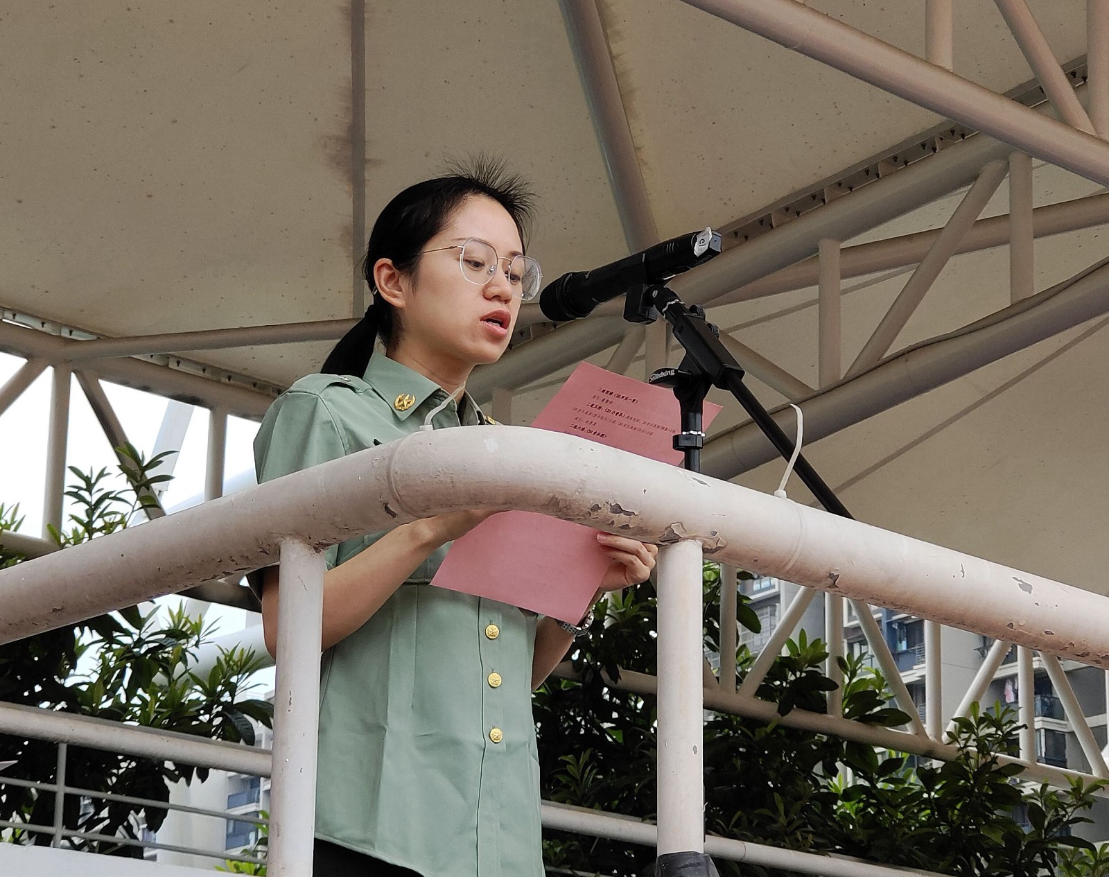 沈军甫致辞,他代表学校对老师们和教官们致以衷心的感谢和诚挚的问候,对初跨入浙艺附中学习的257名新同学表示热烈欢迎。他介绍了我校悠久的办学历史、近年来取得的成绩和2020届附中毕业生升学情况。他希望同学们在浙艺学习的日子里做一个有高尚情怀的时代新人,坚守自己的艺术初心,养成良好的行为习惯。同时,他要求新生通过军训端正态度,统一认识,振奋精神,服从命令,严格要求,团结协作,全力投入,顽强拼搏,收获成功。