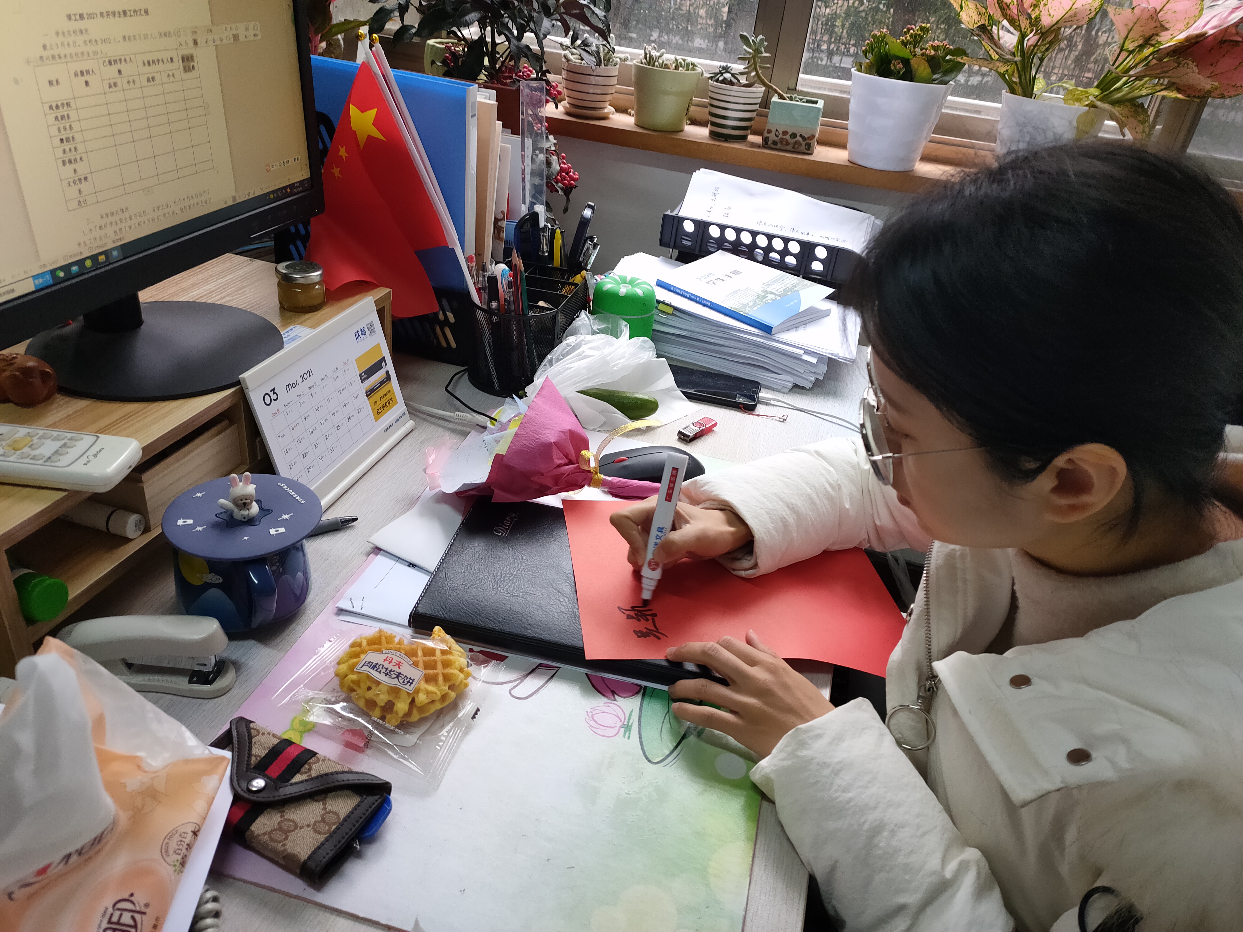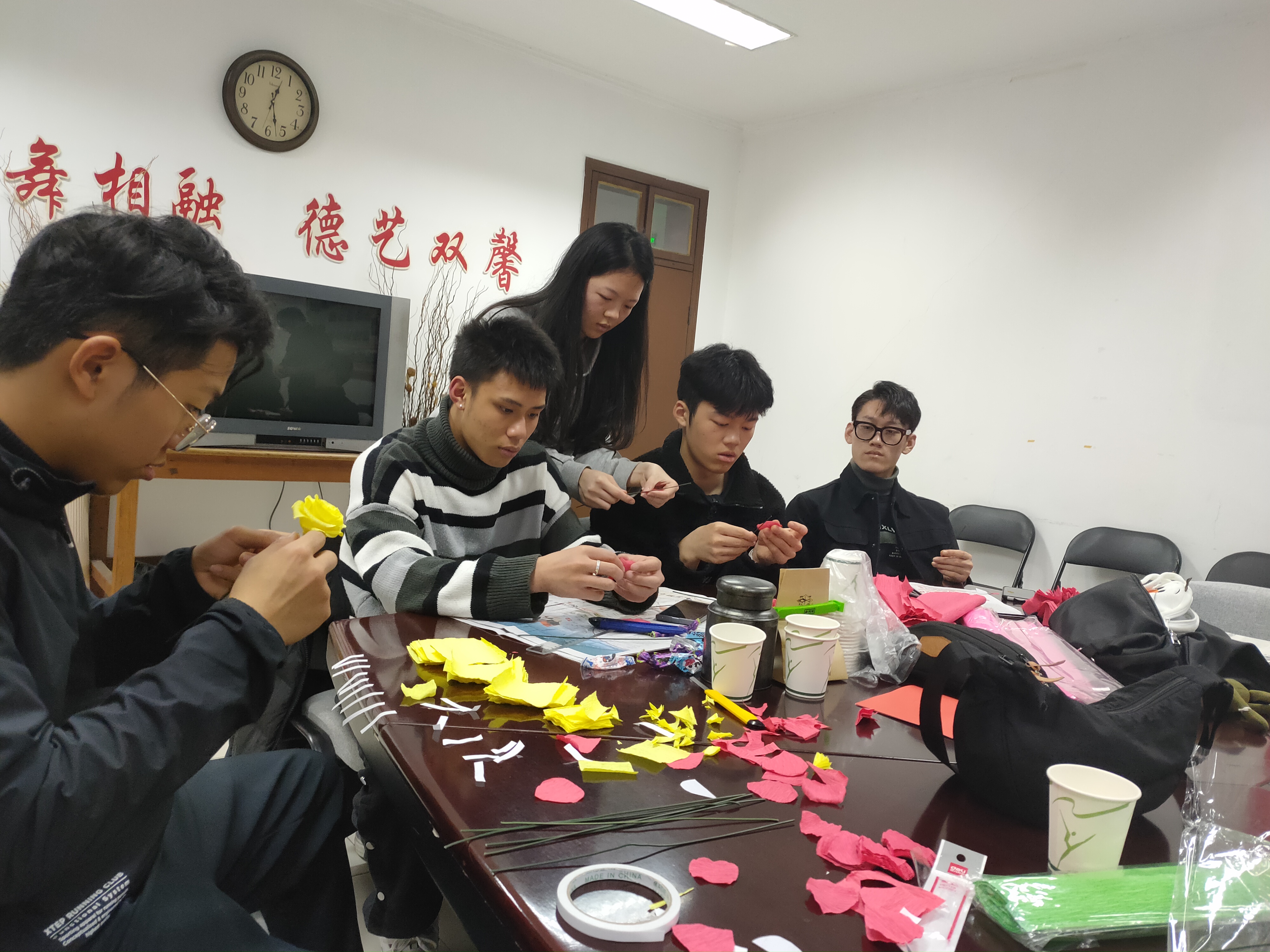 舞蹈系团委学生会的同学们别出心裁,利用周末时间亲手编织爱的花朵,在节日当天给老师们一个惊喜。同学们在前一天准备好了手工制作材料,分工明确,男生女生一起,有的剪“花枝”,有的剪“花瓣”,有的把“花瓣”们粘成“花朵”,有的把做好的“花”包装好。心灵手巧的他们从零学起,仅用一整天的时间就做出了300朵手工花。