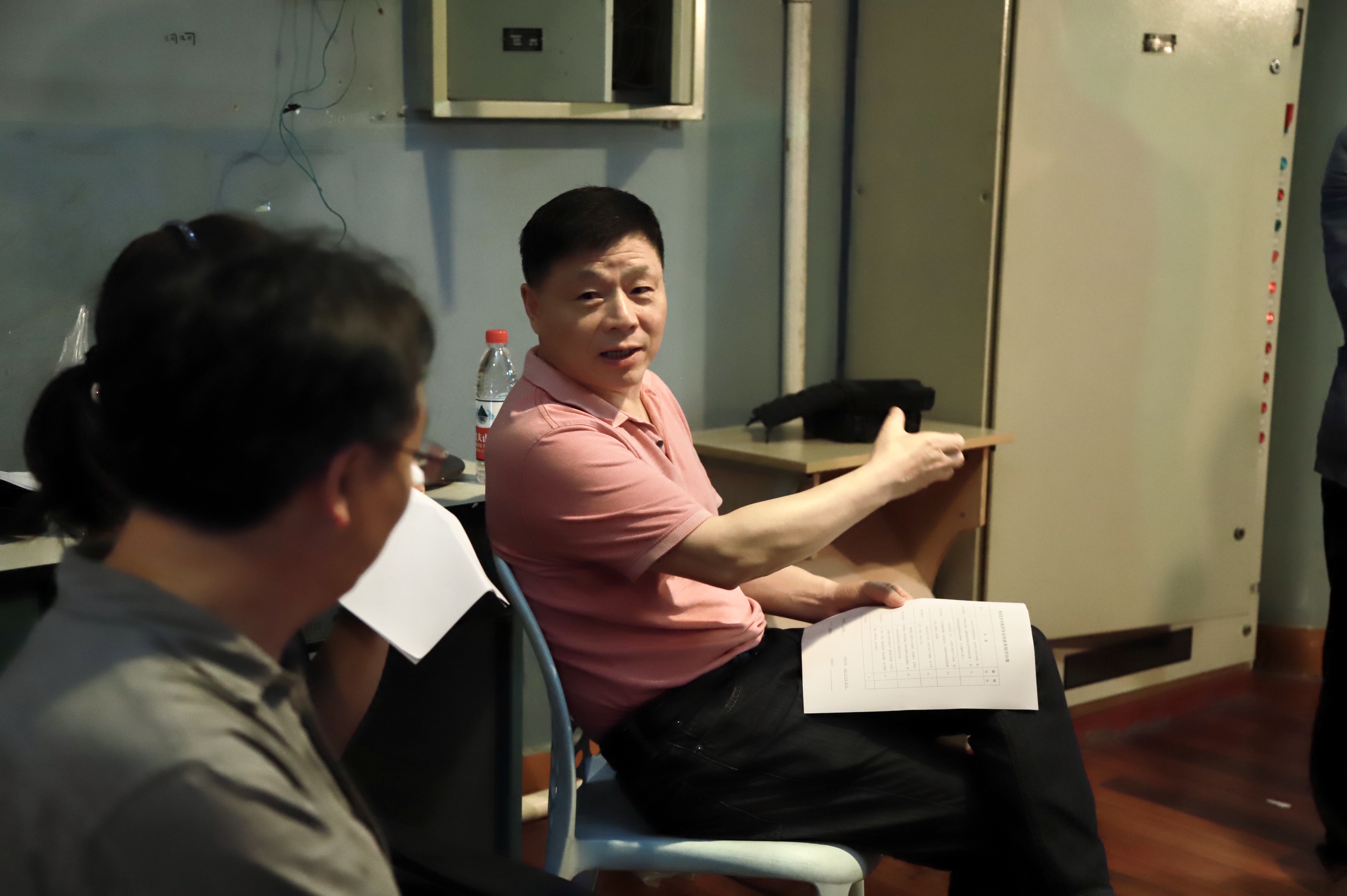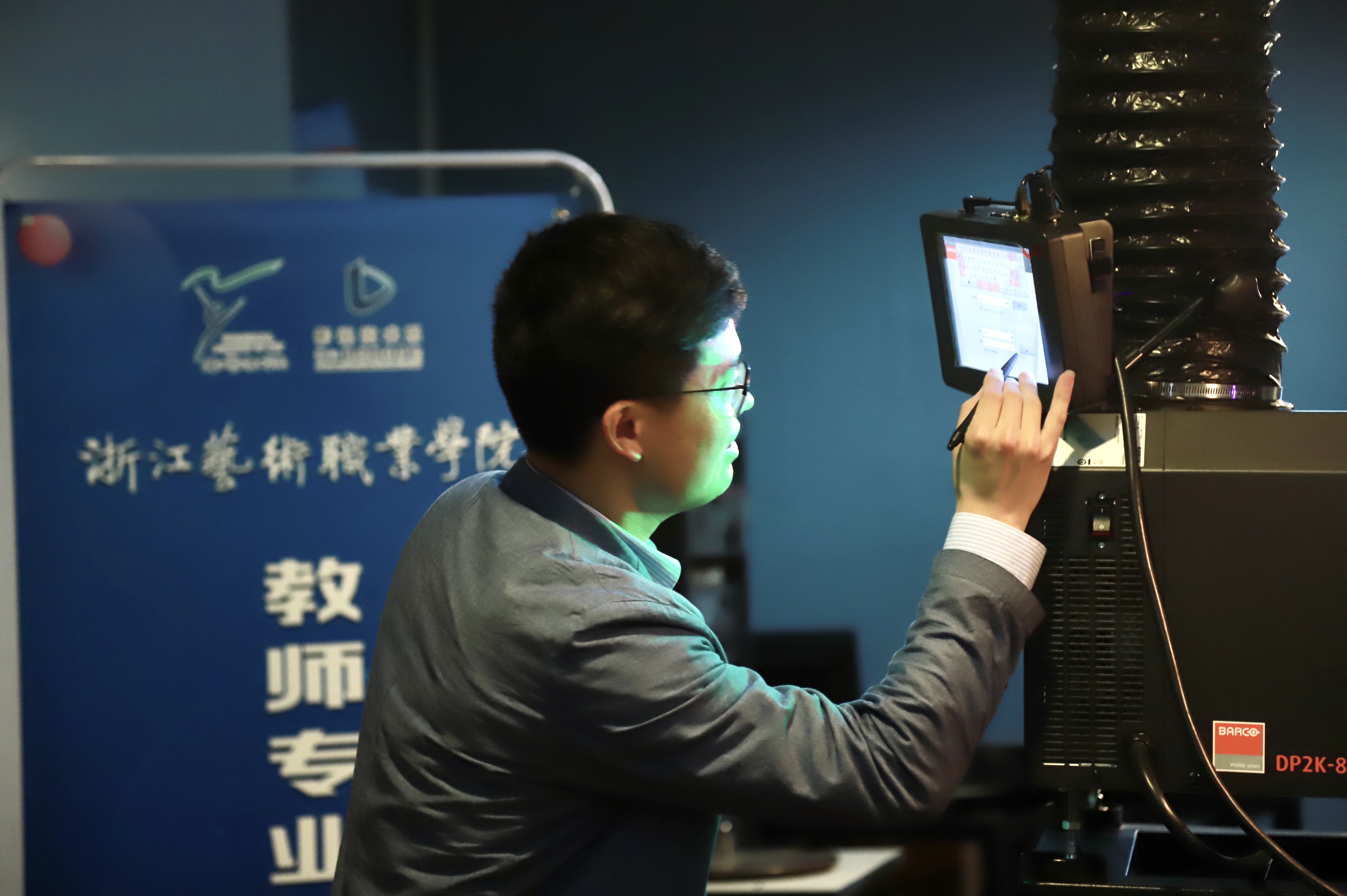 郑可飚是声像工程技术教研室主任,他带着学生走进剧场,走进电影放映室,讲解了整个放映系统的操作流程,以最直观的视觉感受进入电影技术实习这堂专业课。他提到电影放映要根据电影放映屏景深的大小运用不同的操作方式,各种操作的细节造就了电影放映的顺利开展。他认为培养学生在实践中解决问题的能力很重要,通过实践共同发现问题,力求引导学生自己解决问题的过程是与学生建立良好的“感知,反馈,共情”关系非常重要的关键环节。