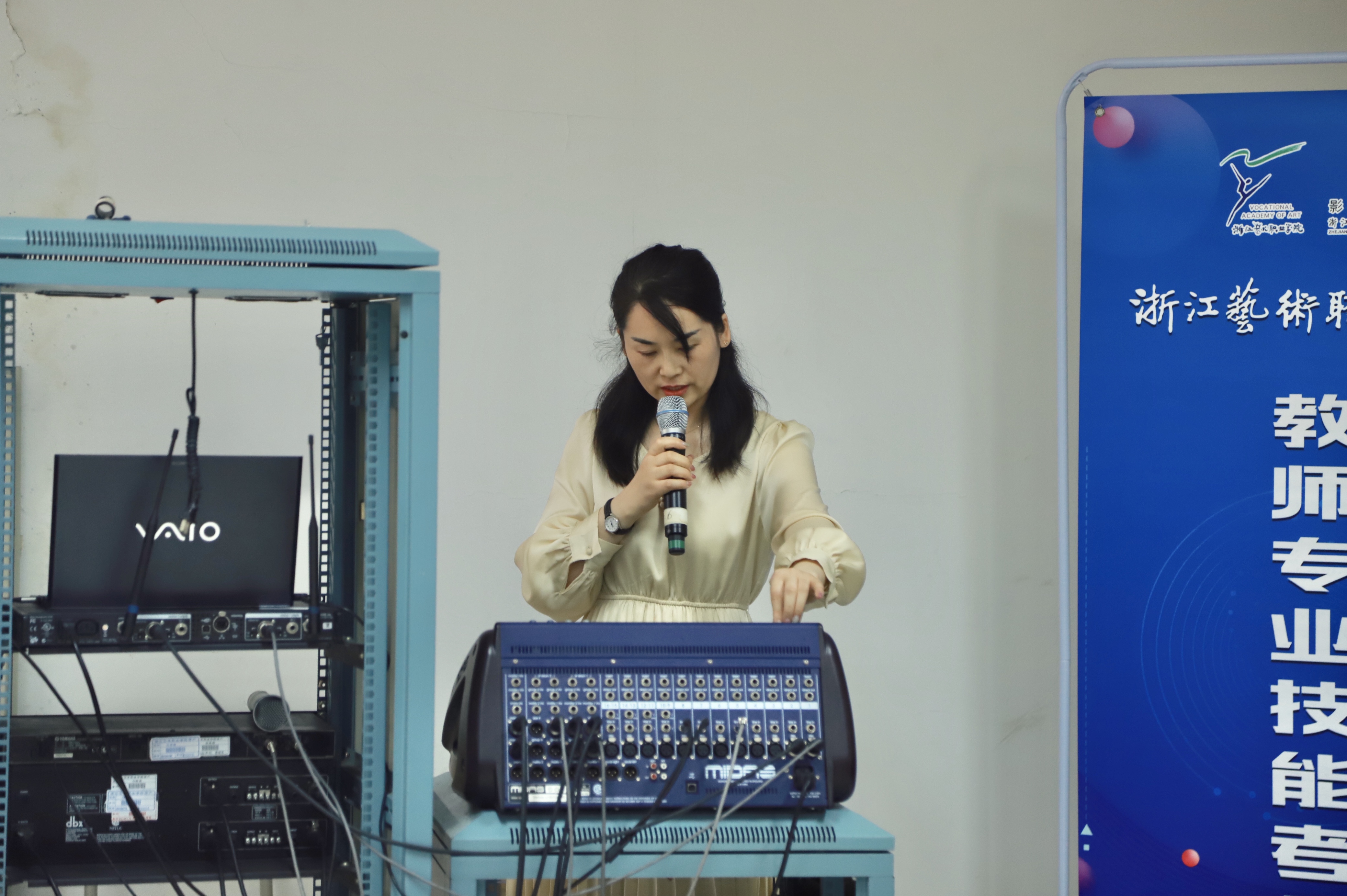 王芳是音像技术专业带头人,在本次考核中以某声乐专业期中考试音响系统连接与调试为例,为大家详细地介绍了音响系统所用的设备,演示了各设备的连接和调试方法,利用现场调音的方法将“调音的艺术”展现在大家面前。她提到在各设备的连接和调试中一定要注意操作顺序,要做到仔细与耐心,培养归置整理的好习惯;要挖掘、践行工匠精神,只有严谨细致的操控才能完美诠释演唱者的声音。