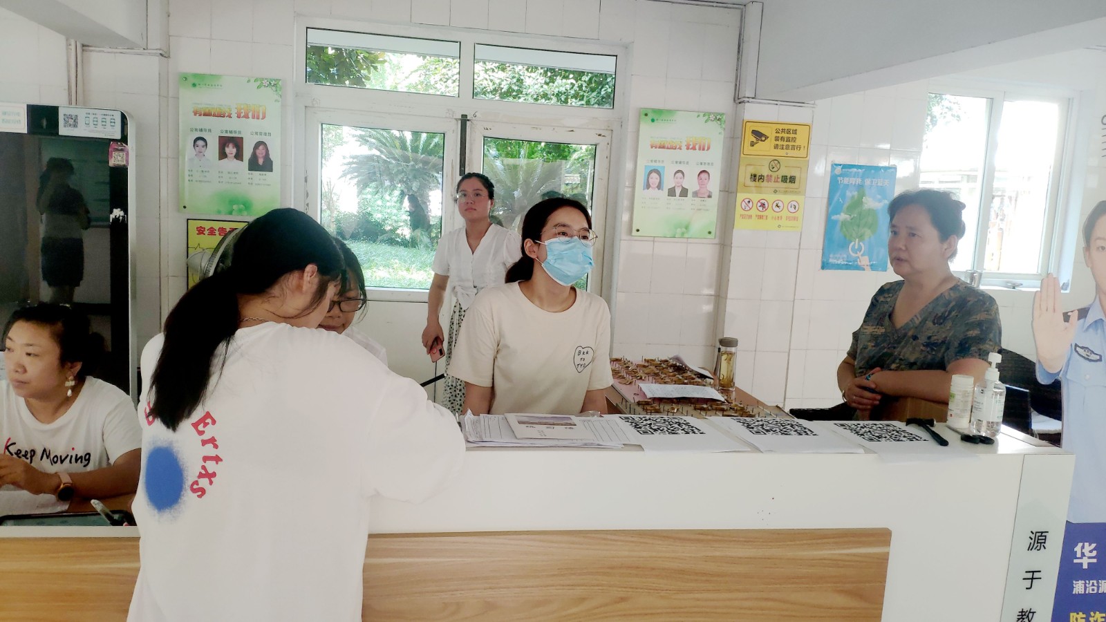 一大早,学生公寓内,公寓辅导员们早早地在一楼大厅迎接学生们的到来。提醒学生打开手机微信扫描返校二维码,为换新寝室的学生发放寝室钥匙、寝室空调遥控器等并进行登记,为行李多的学生拎行李。