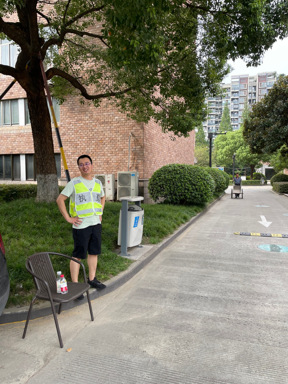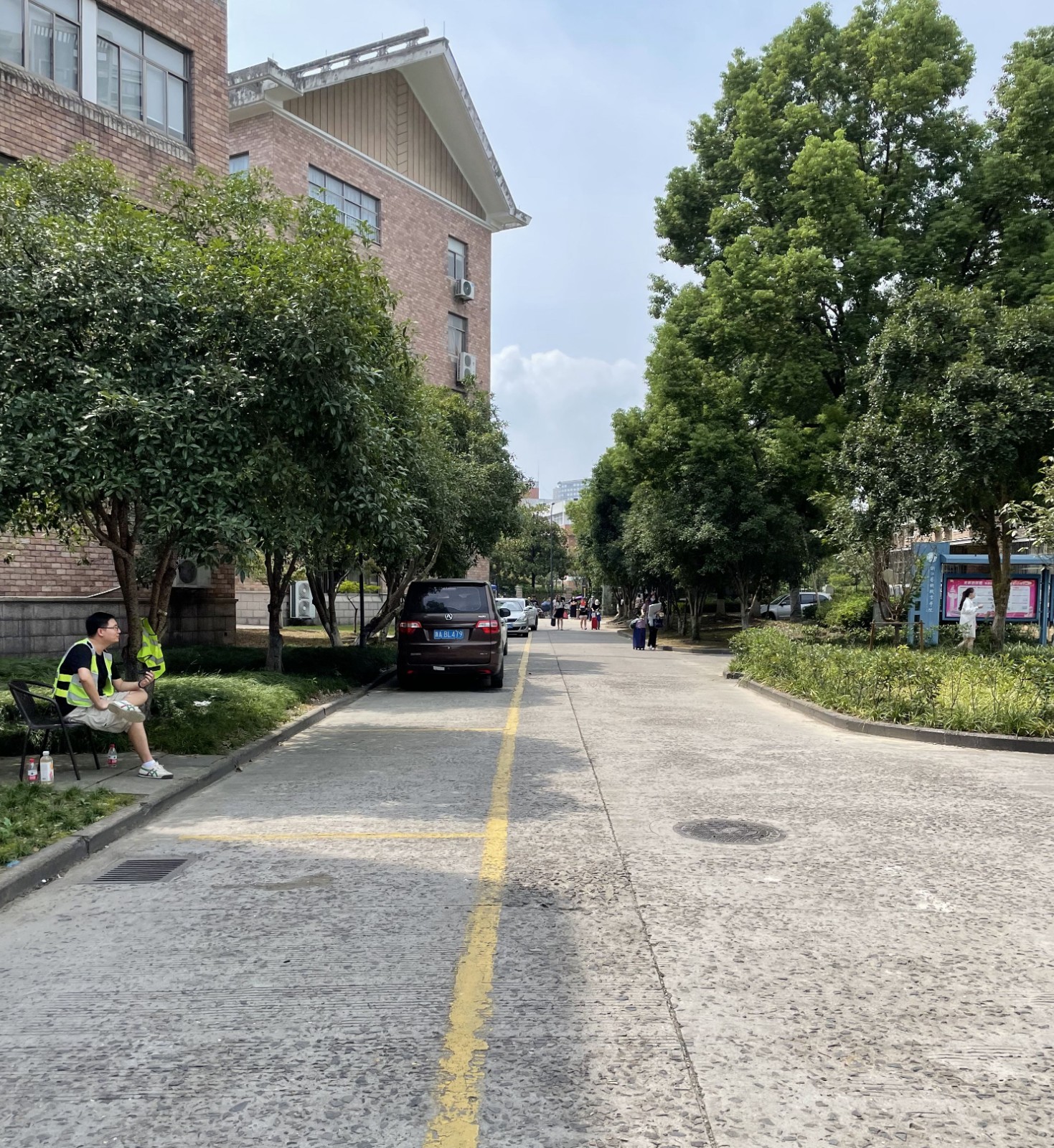 校园内,党员教师们轮流执勤,在校园内道路交叉口处指挥车辆。炎热的天气没有消退教师们服务师生的热情,老师们身穿执勤服,一丝不苟地站好每一班岗。