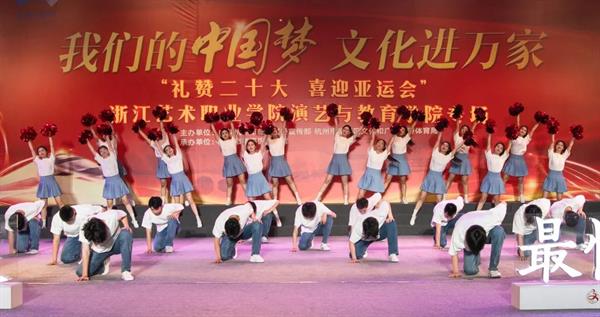 集体舞《等你来》是亚运会志愿者主题曲,表达了艺术学子为亚运会贡献一份青春力量的心愿。演出现场高潮迭起、喝彩不断,同学们以精彩表现赢得了观众们的赞扬与认可。